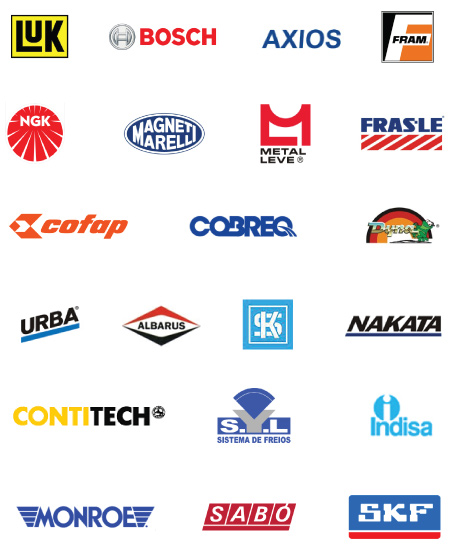 NGK, Luk, Nakata, Monroe-Axios, Cofap, Perfect, Paraflu, Valeo, Visconde, Cobreq, Controil, MTE-thomson, Lubrax, Havoline, Motul, Bardahl, TSA, Car-80, Metal Leve, Mahle, Wega, Fram, ATE, TRW Vargas, Sabo, Elring, Heliar, Fremax, 3RHO, Florio, Gonel…